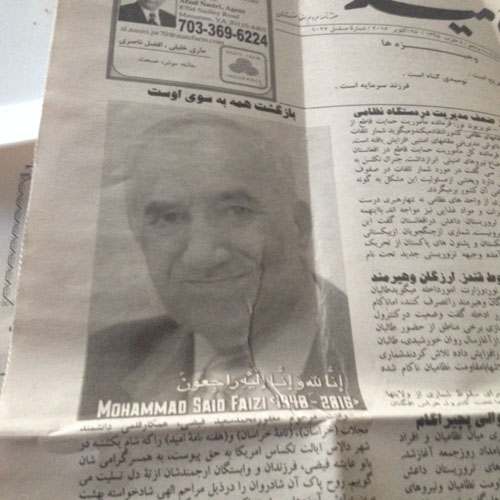 همچنين در شماره ( 1026) اميد فوتوی مرحوم جناب محمد سعيد فيصی ( غوربندی) به جشم می خورد که در اثر سکته قلبی پدرود حيات گفته. چون ايشان از نويسندگان مشهور وطن و همکار گرامی اميد و صاحب آثار قيمت داری در زبان دری فارسی هستند ، ما روح شان را در جوار رحمت الهی می خواهيم و به خانوده گرامی خصوصا همسر عزيز داغ ديده اش عرض تسليت داريم.